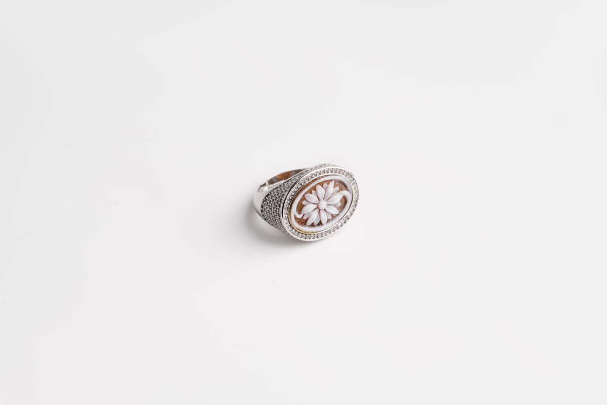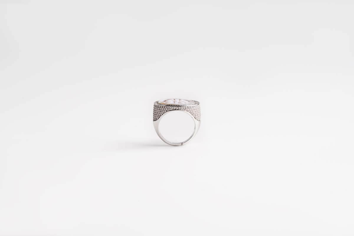 Anello in argento 925‰ con cammeo inciso a mano.Dimensioni cammeo 2 × 1,5 cm.Anello con misura regolabile.