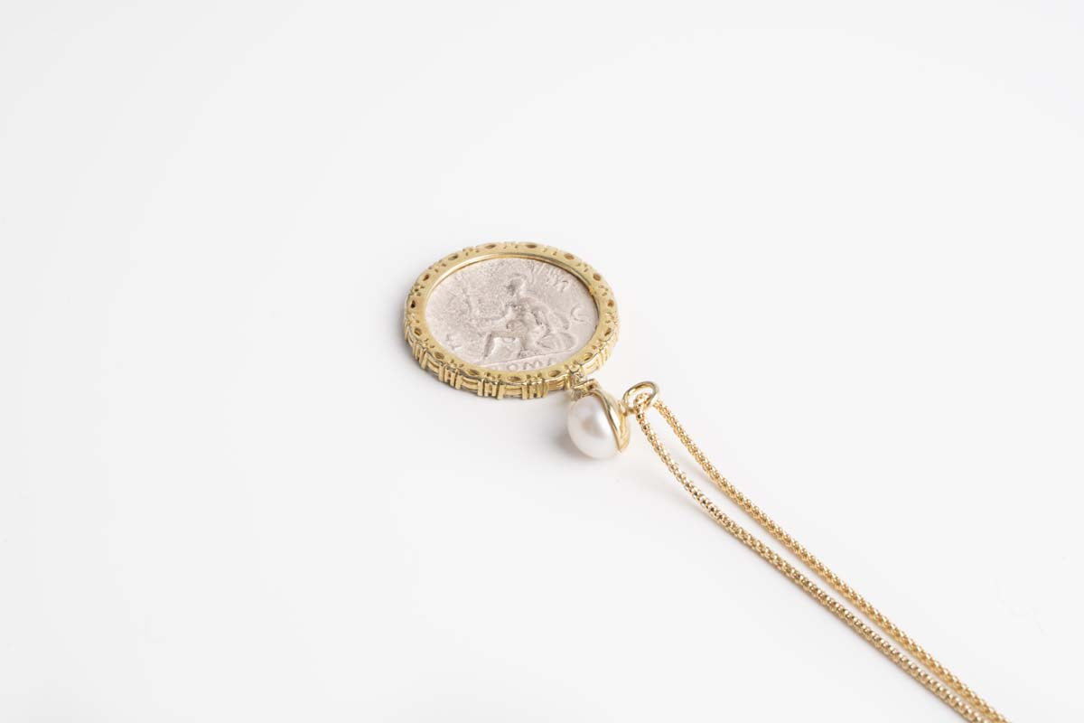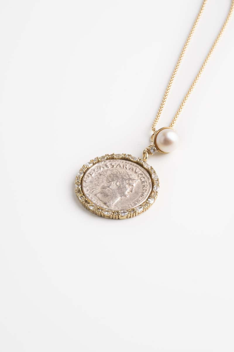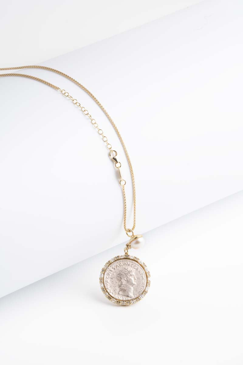Ciondolo in argento 925‰ rodiato oro con inserto a moneta antica, dettaglio di cristalli Swarovski e perla.Collana in argento inclusa.Ciondolo dal diametro di 3 cm con perla da 8,5 mm.Lunghezza catena 45 cm, regolabile.