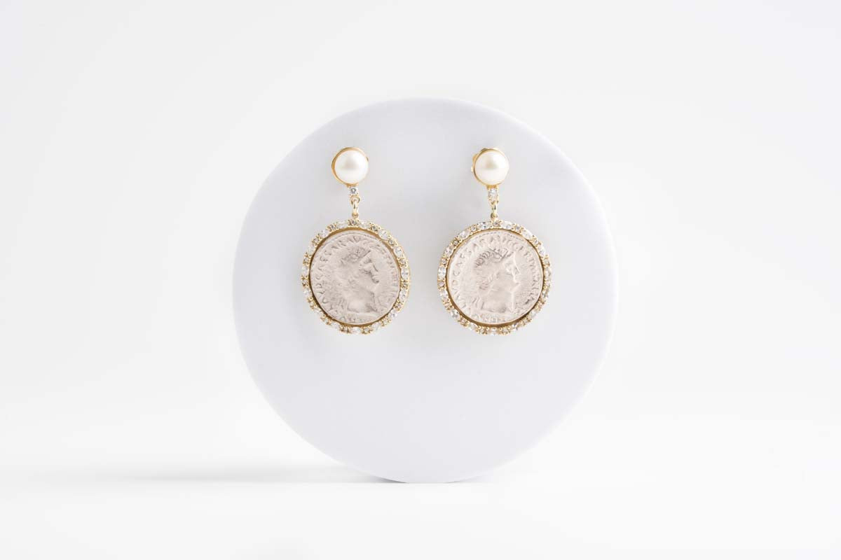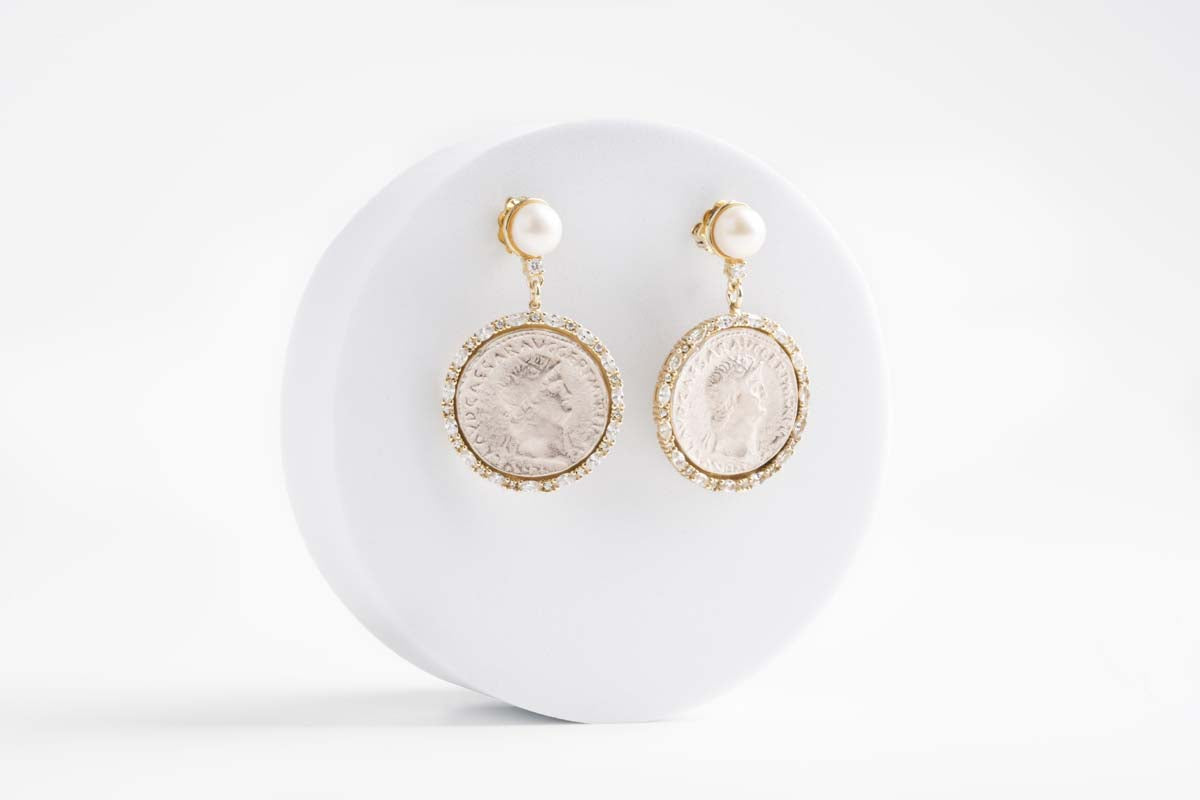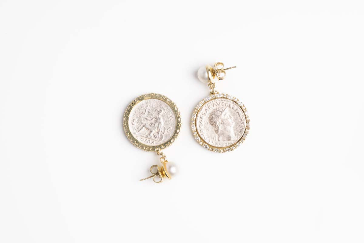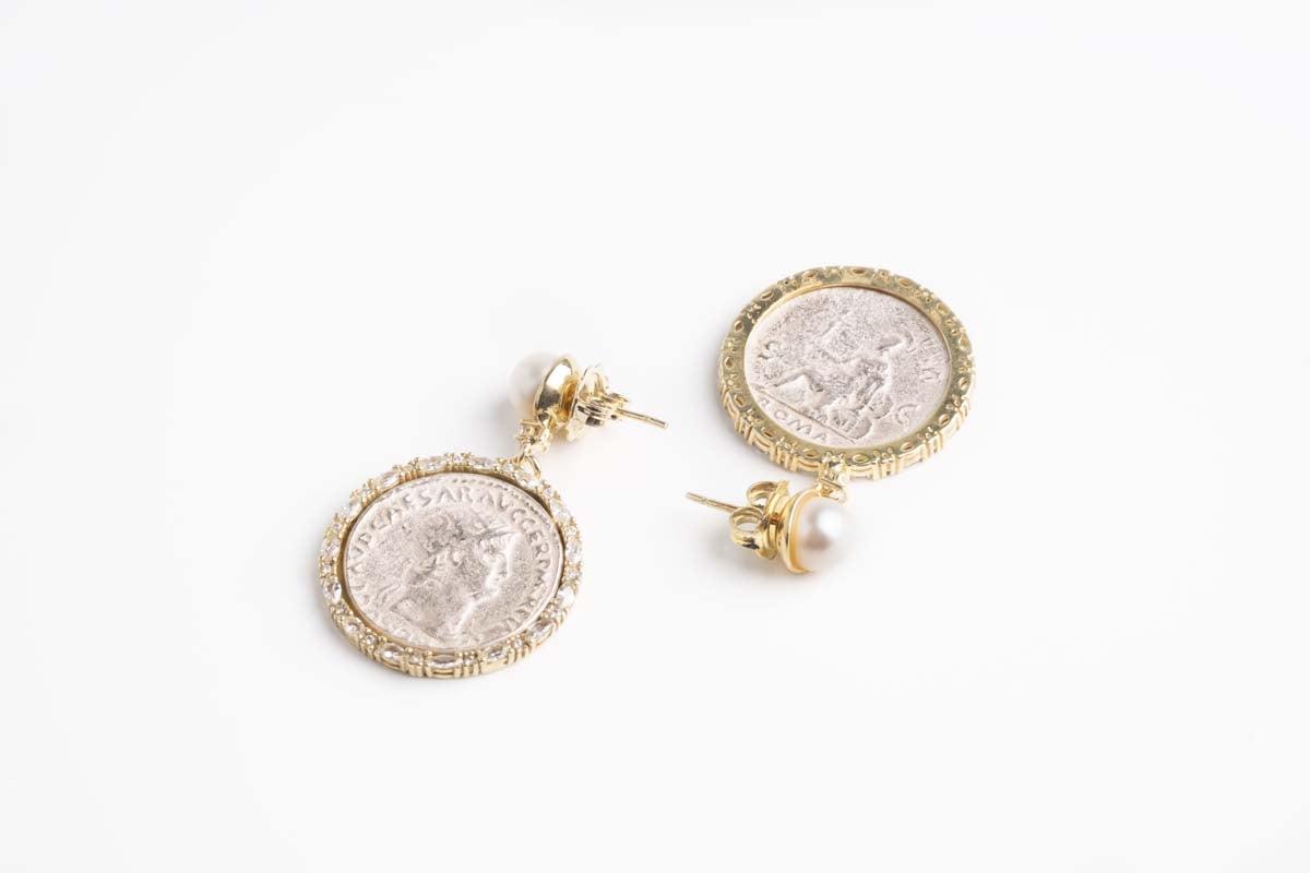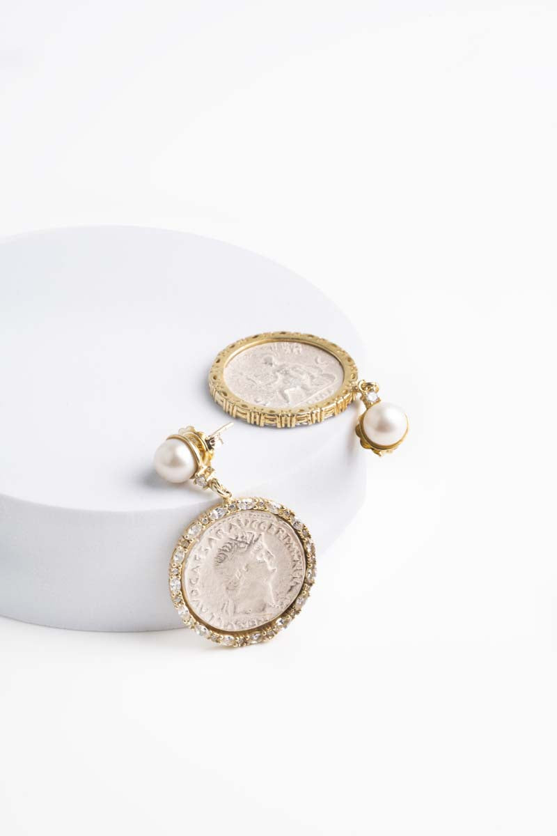 Orecchini in argento 925‰ rodiato oro con inserto a moneta antica, dettaglio di cristalli Swarovski e perla.Pendente dal diametro di 3 cm, perla da 8,5 mm.Chiusura a vite.