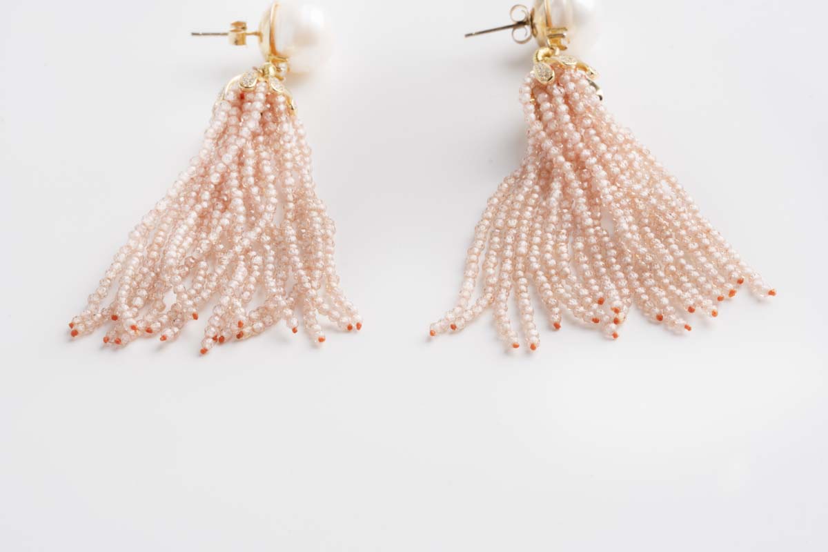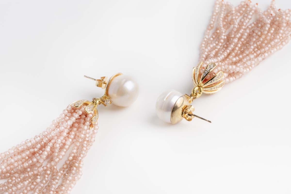Orecchini in argento 925‰ rodiato oro con perle di acqua dolce e nappine pendenti in pietre Swarovski rosa.Lunghezza orecchini 9 cm.Perle dal diametro di 12,5 mm.